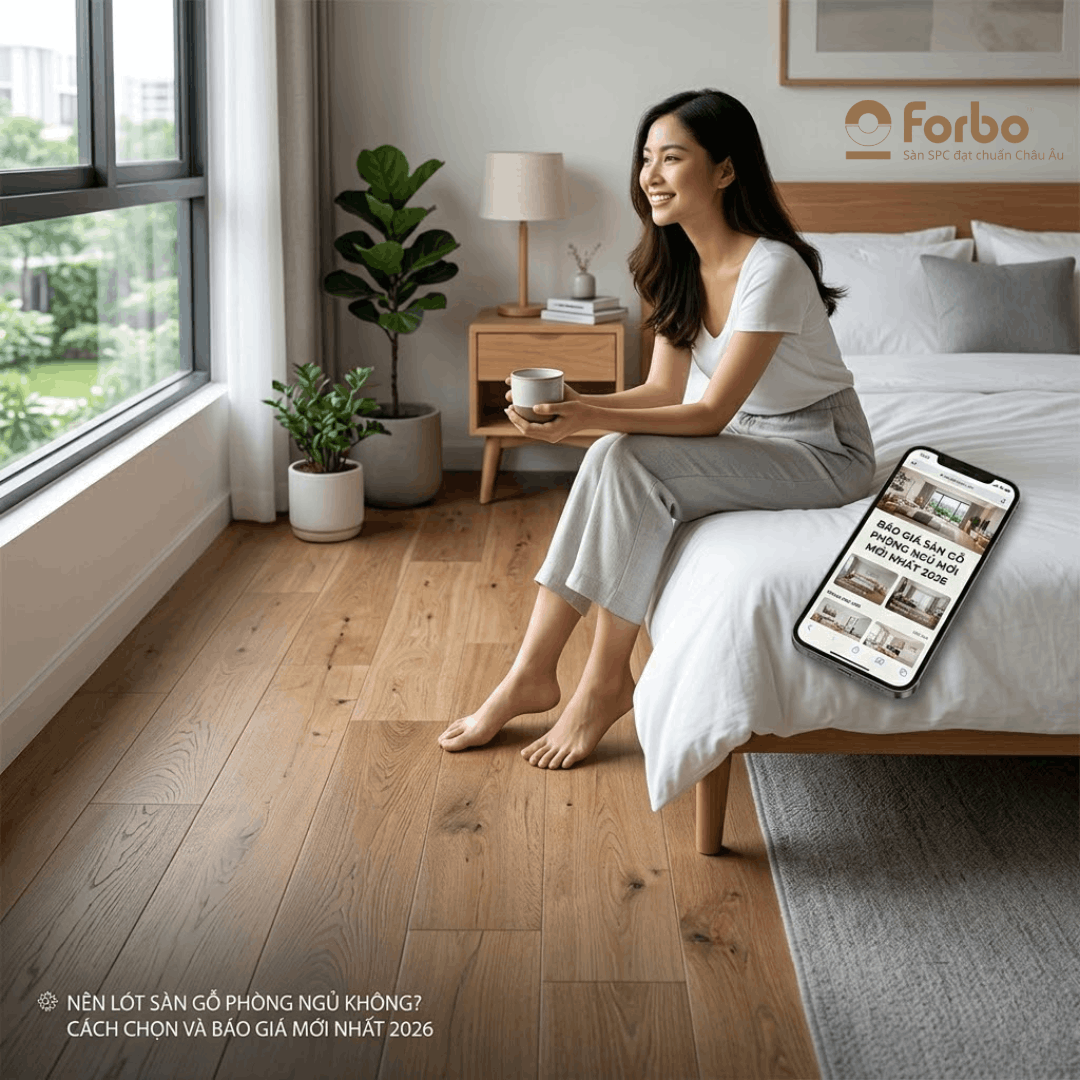Kết luận: Lót sàn gỗ phòng ngủ là một khoản đầu tư xứng đáng cho sức khỏe và cảm xúc. Tuy nhiên, thay vì chọn các loại sàn gỗ công nghiệp dễ hư hại, hãy cân nhắc Sàn nhựa SPC Forbo để tận hưởng sự bền bỉ và đẳng cấp chuẩn quốc tế.