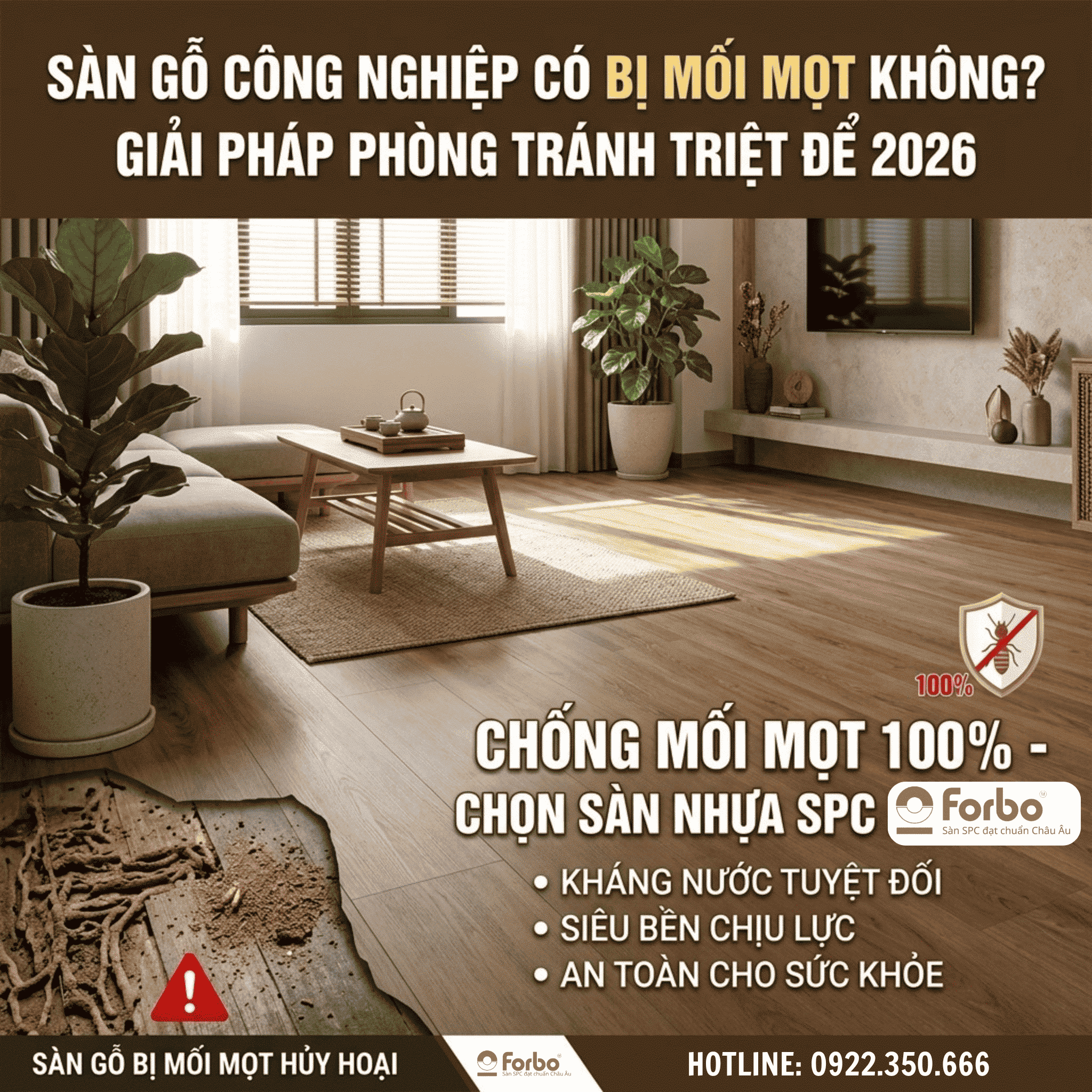 Kết luận: Phòng tránh mối mọt không chỉ dừng lại ở việc dùng hóa chất, mà quan trọng nhất là chọn đúng vật liệu ngay từ đầu. Thay vì lo lắng về việc bảo trì sàn gỗ hàng năm, việc đầu tư vào sàn nhựa giả gỗ Forbo là quyết định thông minh để bảo vệ tổ ấm của bạn bền vững suốt 20 năm.